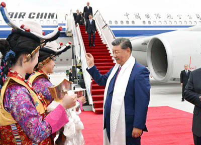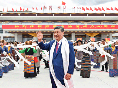8月20日中午,中共中央总书记、国家主席、中央军委主席习近平率中央代表团乘专机抵达拉萨,出席西藏自治区成立60周年庆祝活动。习近平等从机场乘车到住地途中,各族群众在街道两旁热情欢迎。新华社记者 高洁摄