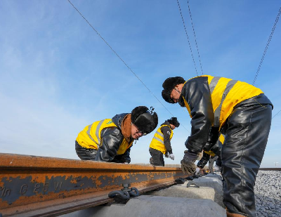 11月25日,在黑龙江省绥化市庆安县永华村哈伊高铁哈铁段铺轨现场,施工方中铁二局的工人将最后一对钢轨螺栓拧紧,标志着我国“十四五”重点工程哈伊高铁全线铺轨贯通,为后续联调联试奠定基础。哈伊高铁是我国“八纵八横”高铁网京哈—京港澳通道的重要延伸,也是在建纬度最高、全年温差最大,且首条穿越多年岛状冻土区的高速铁路。新华社记者 王松摄