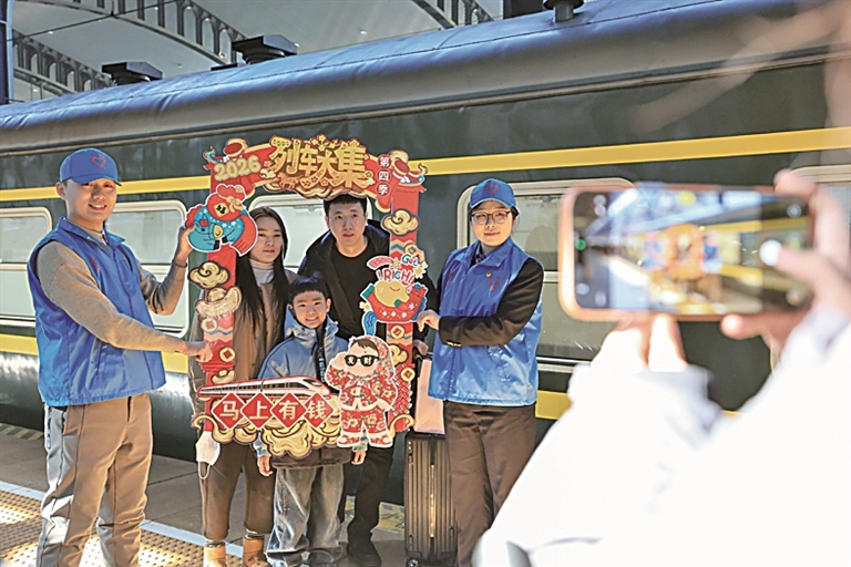 旅客在哈尔滨站站台上与K7103次列车青年志愿者合影留念。徐率摄/光明图片