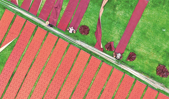 4月11日,在广西梧州市龙圩区广平镇淑里村一家丝绸制造企业的草坪上,工人们利用天气晴好的时机,忙着晾晒香云纱。香云纱是一种纱绸制品,其染整技艺是国家级非物质文化遗产。近年来,梧州市鼓励和扶持丝绸企业发展壮大上下游产业链条,推动产业转型升级助农增收。